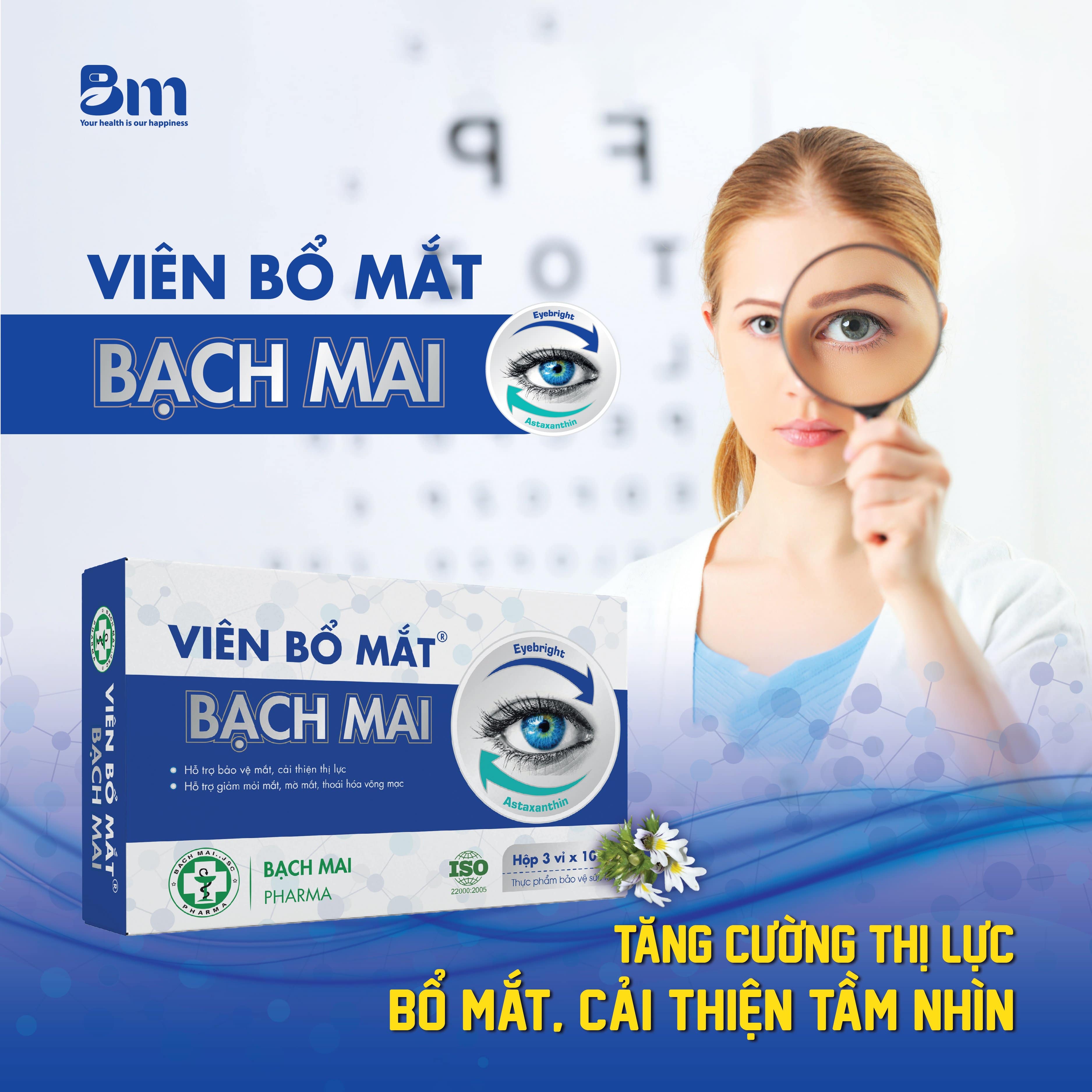 Viên bổ mắt Bạch Mai là sản phẩm hỗ trợ chăm sóc sức khỏe thị giác, kết hợp chiết xuất Eyebright (Sáng mắt), việt quất, DHA, Lutein và các vi chất như kẽm, vitamin E, astaxanthin. Công thức giúp tăng cường dưỡng chất cho mắt, hỗ trợ giảm cảm giác mỏi mắt, nhìn mờ và hỗ trợ duy trì chức năng thị giác trong điều kiện làm việc và học tập căng thẳng.